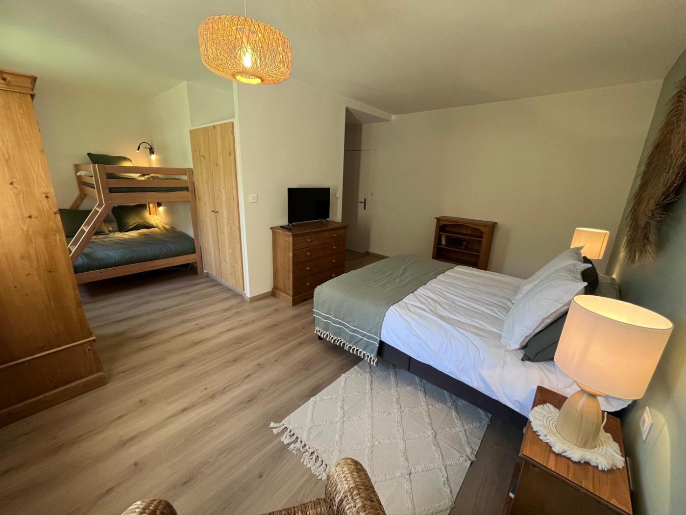 Chambre Familiale avec Salle de Bains Privative. The family room provides a wardrobe, an electric kettle, as well as a private bathroom featuring a shower and a hairdryer. This family room features parquet floors, heating, a flat-screen TV and garden views. The unit offers 3 beds.